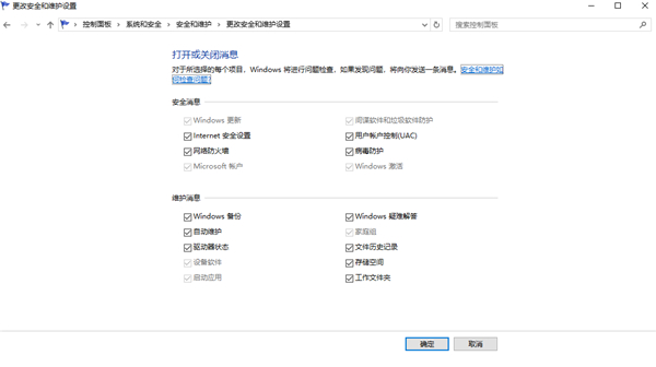 先点击更改安全和维护设置 → 把 安全设置、用户账户控制、网络防火墙、病毒防护 全部取消勾选点击确定