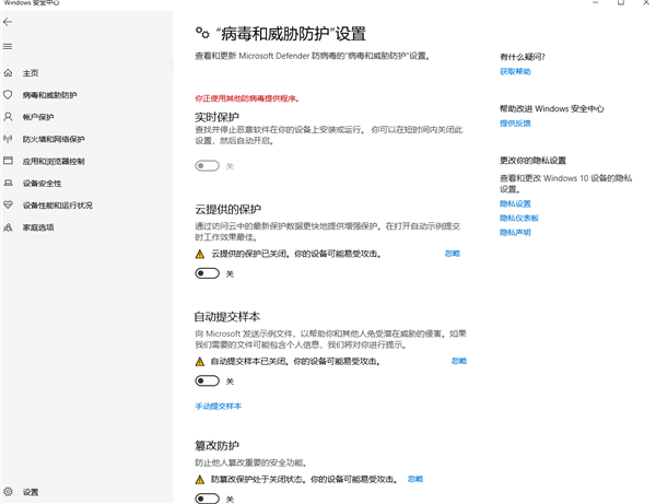 点击左侧病毒和威胁防护 → 下拉找到病毒和威胁防护设置 → 管理设置 → 所有通通关掉下拉到底全部关掉(如没有管理设置需要开启扫描后,重新进入即可显示)
