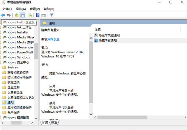 接着点击“管理模板/Windows组件/Windows安全中心/通知”进行以下一项操作
