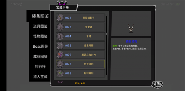 白骨钉刺和荆棘双刺类似,不过这个武器召唤的是骷髅;关键时候拉出来挡刀还是挺安逸的,而且攻击力也比荆棘双刺高,看到有就拿上吧。