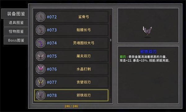 和神圣双剑一样,邪铁双刃同样是充能类后期武器。不同的是它的充能效果是增加攻击+击退怪物,不过击退效果对于boss无效所以用起来比神圣双剑稍逊一筹。不过毕竟失落城堡是一个充满随机性的游戏,所以如果看到了可以先用着。