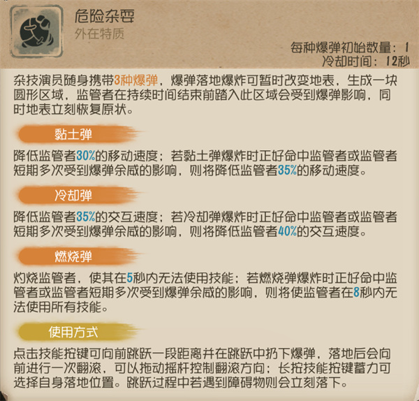 杂技演员每局最多可拥有6个爆弹(每种2个),当爆弹消耗完后不可替换其他道具,所以要谨慎使用。切换爆弹时会有一个切换的动作,在切换爆弹时无法通过祭司的【门之钥】,在治疗队友的过程中切换爆弹也会中断治疗过程,但是破译密码机或坐上狂欢之椅后切换爆弹不会有切换动作。