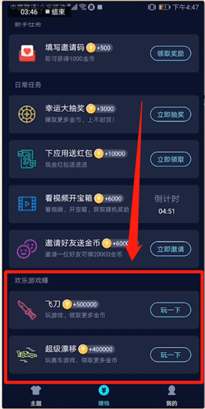 欢乐游戏赚:玩飞刀和超级漂移游戏可以获得更多金币哦。