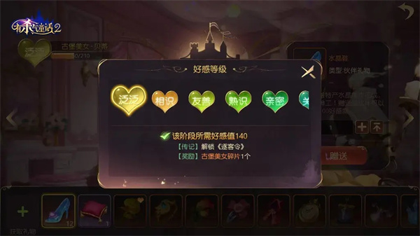 提到好感度就要提到在结缘时,我们除了抽到伙伴和魔法糖果外,还会抽到另一种奇特道具——伙伴礼物。在送礼页面,我们可以通过给伙伴送出礼物,来提升与伙伴之间的好感度。每次好感度升级,伙伴都会给与一定的奖励。