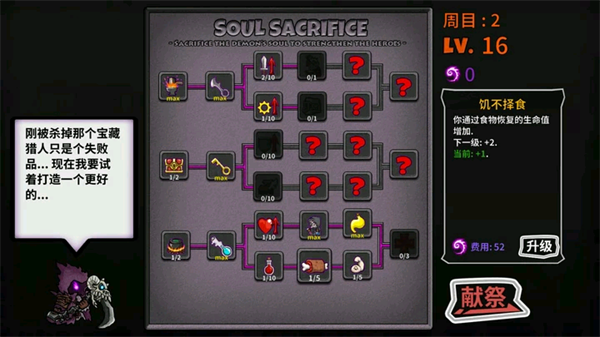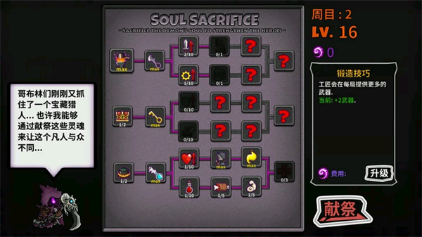 武器是决定游戏进展的最重要道具之一,在灵魂献祭技能中玩家应该首先把初始获得工匠赠送武器,这样我们在前期最少可以遇见一把品质不错的武器,让我们前几关能更轻松的度过。