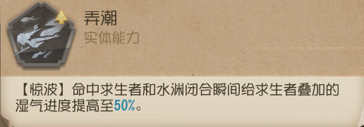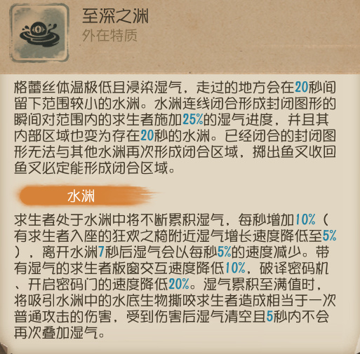 被求生者在板区迂回牵制时可以利用水渊将板区围起来形成闭合区域,为闭合区域内求生者叠加湿气值,逼迫求生者转点。