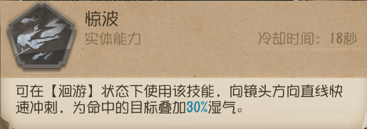 此时可以利用冲刺命中求生者再瞬间收回鱼叉为求生者叠加100%湿气值并造成一次普通攻击伤害,紧接着补上一刀令其倒地。 在二阶后连续使用两次【惊波】命中同一求生者会直接为其叠加100%湿气值。