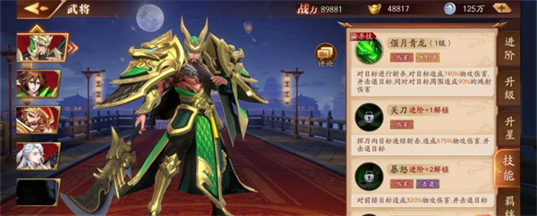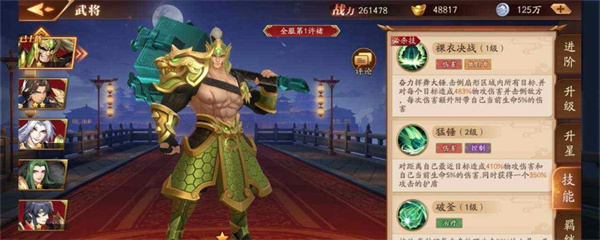 关羽在游戏内属于高爆发角色,必杀技不仅对单体有着高达740%的伤害倍率,还会对附近的目标造成90%的溅射伤害,此外小技能的伤害也相当爆炸并且附加击退效果,虽然自身没什么保命技能,但在进阶+3后可以获得一次免死效果,在高难度副本中往往可以绝境翻盘。