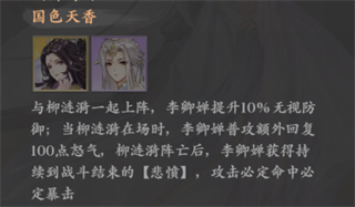 较为冷门的组合,但强度和性价比极高。说是组合,但其实这个组合的重心完全在李卿婵身上。柳涟漪开局必得,只需要通过圣境苍穹获得李卿婵即可激活国色天香,让李卿婵能够获得超高的回怒效果以及100%暴击的能力!(但需要先把柳涟漪祭天)。
