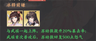前中期最佳组合,开局高额AOE爆发,武瑶自带暴击增幅,造成高额伤害的同时还能触发额外的真伤,苏幼薇自带暴击,怒攻更具有连斩的能力,单体输出能力强大。