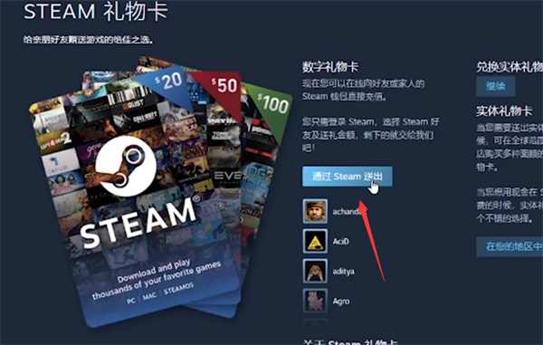 2.steam礼物卡既有实体版本也有非实体版本,但实体版本的steam礼品卡在国内并没有销售渠道,那么本视频仅仅展示steam赠送虚拟礼物卡的方法。在礼品卡点击【通过steam送出】,随后选择一个礼品卡的面值,并选择一个需要送的steam好友。最后根据卡片要求写一些赠送的寄语和赠送人的信息,填写完毕后选择一种付款方式付款即可赠送。