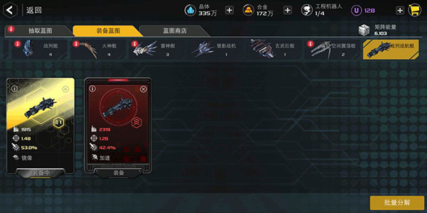 11、蓝图方面要放平心态,100抽吃保底红卡是很正常的,所以除非氪得多,否则入坑前期主力是好的橙卡。获取来源是挑战玩家或矿石转换获得晶体,用晶体十连抽,再批量卖掉白~金卡,然后直接购买所需兵种的橙卡。