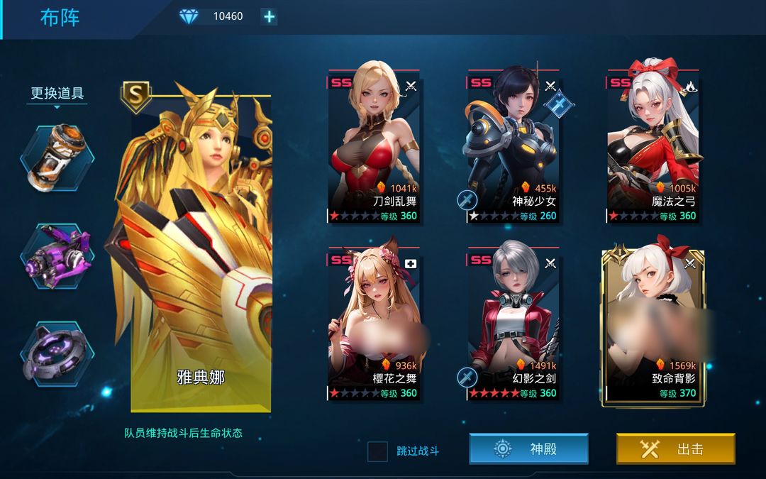 守护神用阿瑞斯,第一回合用闪光飞盘,前排全员带防御机。大锤六号位可以保精灵护盾,持续吃增伤buff,幻影记得叠能量。