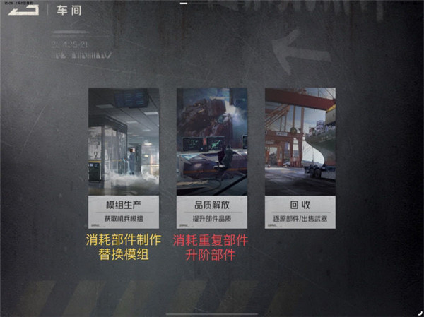 然后就是重头戏车间,在这里能制作能替换的模组,以及部件的升阶还有还原,有其是紫色部件,升阶后能装替换模组,基本上未来除了氪佬紫色部件就是主力,部件池水太深