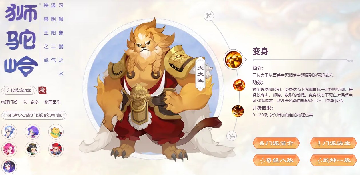 本文致力于给新手推荐最适合自己的门派,梦幻共有物理、法系、辅助和封系四大体系门派,物理门派有大唐官府、狮驼岭、月宫和花果山;法系门派有龙宫、须弥海、魔王寨和小雷音寺;辅助门派有普陀山、化生寺和阴曹地府;封系门派有方寸山和女儿村(只有女性角色可转),接下来就每个门派具体进行分析——