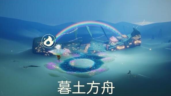 3、飞到一个有船的位置,玩家打坐坐船前往方舟,大蜡烛在彩虹的左边。
