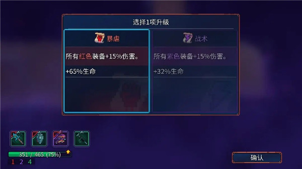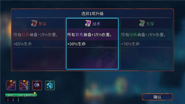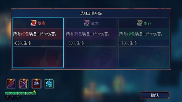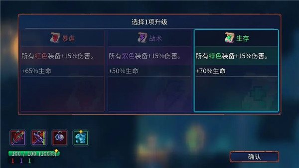 (当前选择的流派是绿流,但是没有绿色(生存)卷轴,所以选择红色(暴虐),以生命值较高的为准)