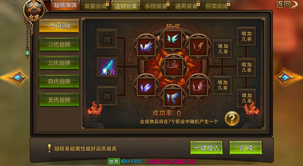 玩家等级到了打副本的时候,可以通过击杀BOSS等方式,获得羽毛,用来合成翅膀的材料。使用合成功能可以根据职业合成各个职业的翅膀,翅膀180级就可以穿戴了。佩戴翅膀可以让角色获得飞行姿态,和强大的属性加成,晋升成高富帅。翅膀是不错,但是也可能合成失败,材料也会丢失。