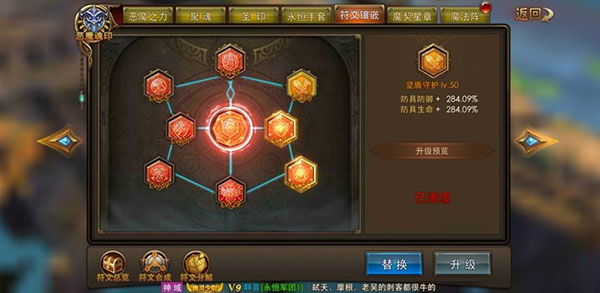 符文系统也是游戏的特色,符文获取方式:挑战符文塔、符文兑换、符文抽奖来。可以为角色增加各种属性加成,初始默认有一个镶嵌槽解锁,通关一定的塔数可以解锁镶嵌槽哦。塔数越高要求的战力越高,所以要求的技术也高