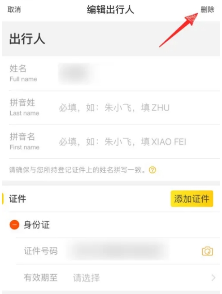 3.选择需要删除的乘车人,点击进入编辑页面,点击右上角的“删除”即可。
