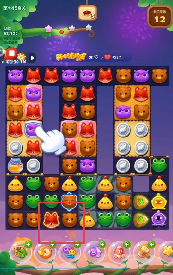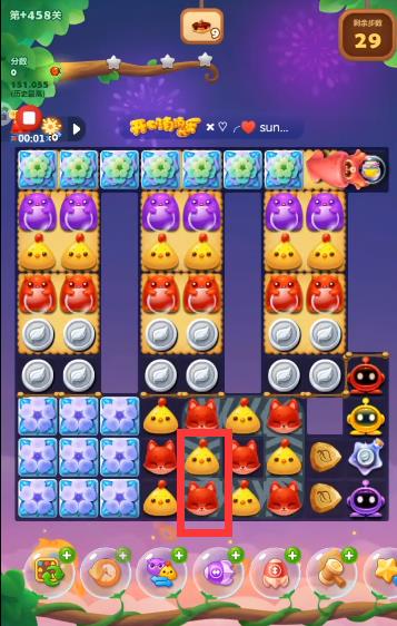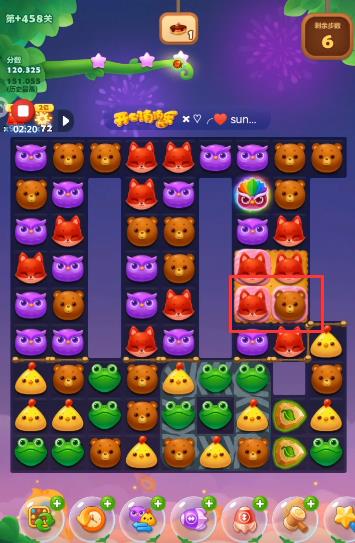 1、开局先将小鸡和狐狸换一下位置,将狐狸和小鸡同时消掉。