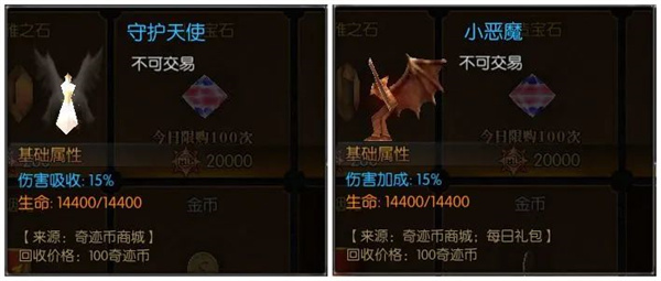 当然两者都不是万能的,而是拥有生命值上限,上限为14400。当玩家受到伤害或发动攻击时,他们都会根据伤害减少一定血量。当生命值为零时,守护天使与小恶魔将消失,玩家需要重新获取才能激活。