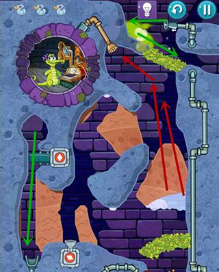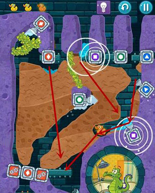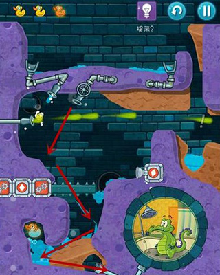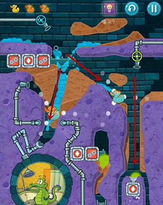 绿色机关开启后,放出的水开启蓝色机关,再去收集第二只鸭子,鸭子收集后去开启紫色开关就OK。最后把水汇合在一起。