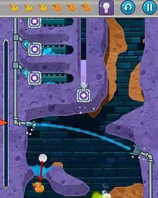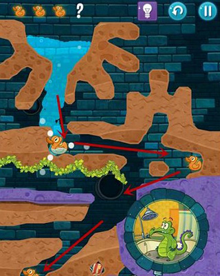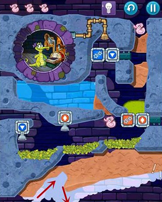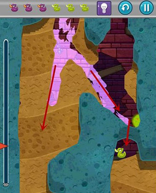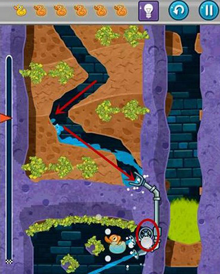 右上角的鸭子,这边需要一个小小的技巧,划开一个缓冲坡道让水直接冲上去收集鸭子。