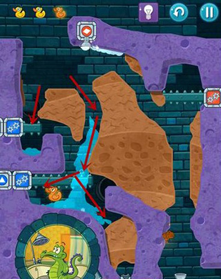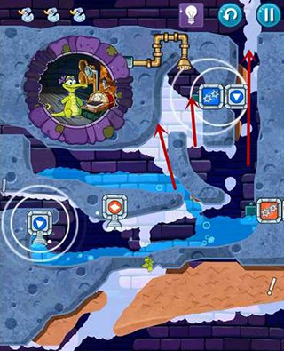 先储存好大量的水,然后划开腐蚀水喷头下面的泥土,让腐蚀水去开启红色机关。最后划开两条道路去收集鸭子,只要清水比腐蚀水优先到达小顽皮的屋子就可以了。