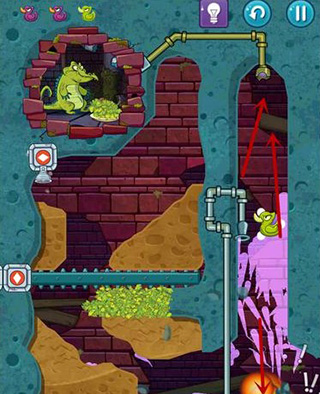 绕开一个个的腐蚀水坑,毒水碰到的话就会产生爆炸。分流出去一小部分毒水去收集鸭子,到第二只鸭子的时候如果毒水过少,按着旋钮也是可以收集鸭子的。