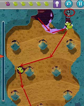 和上一步一样单手操控,不过要控制一部分毒水去开启蓝色开关(要迅速),这样才能顺利收集第六只鸭子。