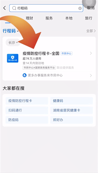 2.输入行程码再点击搜索,这时点击“疫情防疫行程卡”小程序,