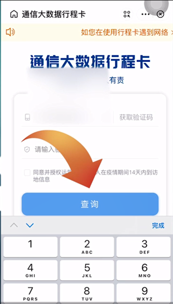 第三步:进入行程卡页面后,输入手机号,然后再输入验证码,接下来再点击查询即可获取行程码了。