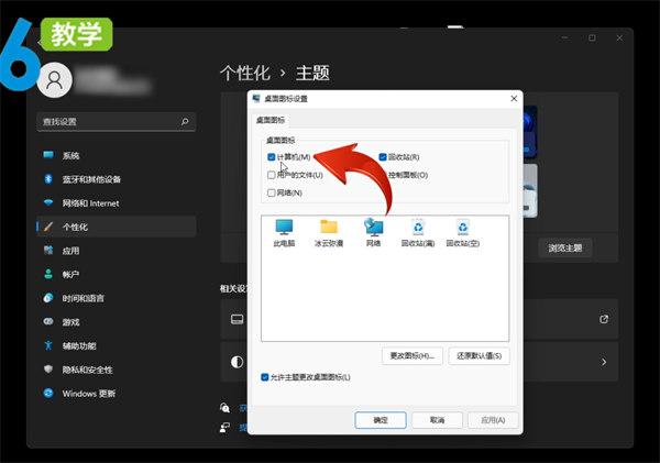 2. 在个性化设置中选择设置主题,再选择桌面图标设置,最后勾选桌面图标中的计算机即可在桌面中添加该图标,同样也可以通过这个方法来移除桌面上的多余系统图标,转而使用快捷栏来启动系统功能。