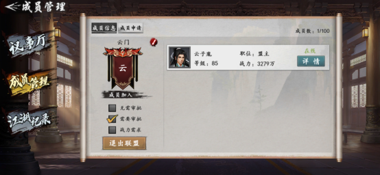 成员管理:玩家可在此处查看审批武林盟成员,和一些武林盟信息的修改