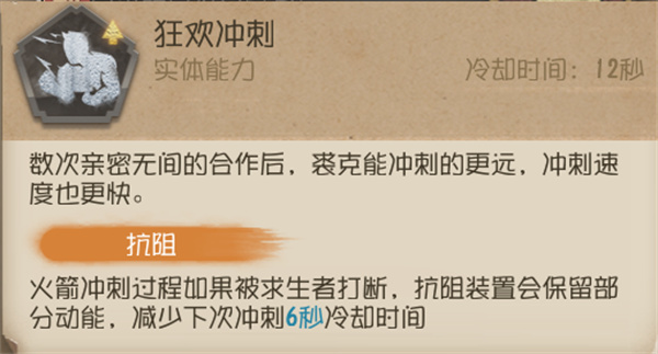 冲刺的过程中被慈善家的手电筒打断,技能会被封锁5秒,返还的6秒CD会在技能封锁结束后开始计算(杂技演员燃烧弹封锁技能同理)。
