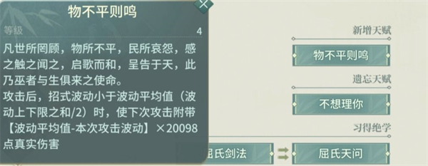 评价:屈心真实伤害=(当前招式波动结算后波动平均系数-本次攻击波动系数)×真伤基础值。真伤基础值受基础攻击影响,而攻击波动差值系数主要受屈心天赋“剑光浮沉”影响,利用高上限和低下限转化真伤。