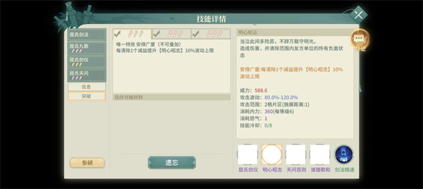 二技能:明心昭志,范围清除我方单位负面状态后再攻击。1突每清除1个减益提升【明心昭志】10%技能威力波动上限。