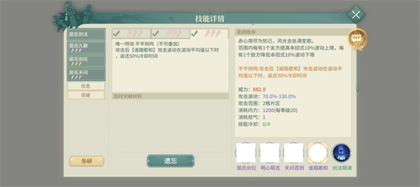 重要天赋:两大核心天赋折光逆剑(根据敌方数+17.5%技能威力),剑光浮沉(奇数攻击取波动下限,偶数攻击取波动上限)。至空至明(受伤40概率减全技能冷却),奋战,清心,都怪你(转移自身减益)。