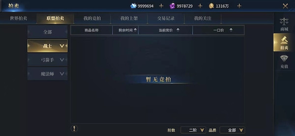 联盟拍卖是在玩家加入联盟之后,可以在联盟内部进行相互交易拍卖的玩法,与世界拍卖类似,但是限制为只能在自己的联盟之内进行拍卖或者购买操作。3、我的竞拍