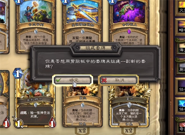 2.将复制的卡组代码发给相对应的用户就可以让对方能复制使用卡组,同样在炉石传说的收藏页面,复制收到的卡组代码,回到游戏后游戏会自动提示是否要保持收到的卡组信息,选择确认后即可使用卡组代码生成卡组。