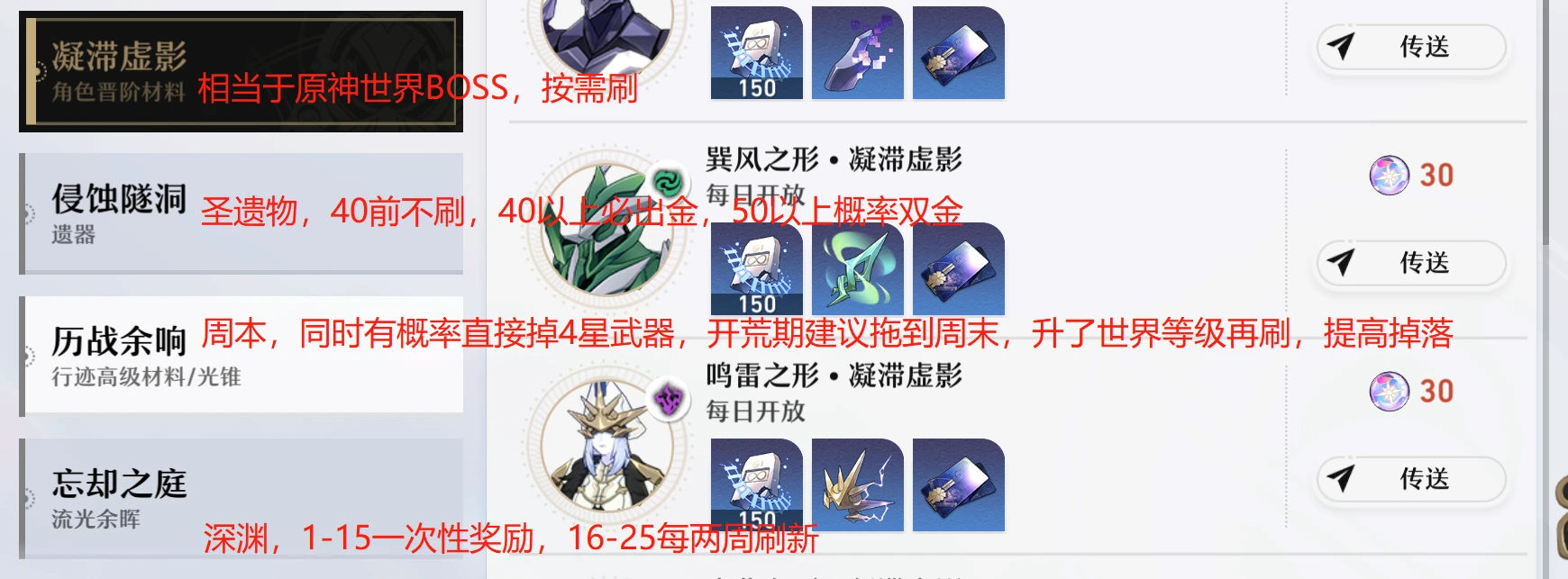 2、不要像平时玩单机RPG那样,探索完一个区域再去下个区域,这个游戏的培养资源比原神更紧缺,需要会过日子!一直到感觉今天不想继续推主线了的时候再看看接下来哪个角色要突破了。下图是各副本的刷取建议(红字描述针对的是左边七大项而不是右边的具体位点)