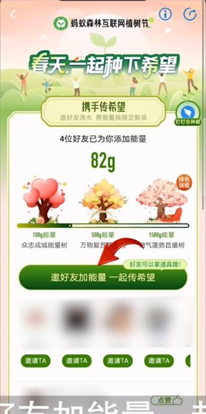 只要邀请好友为自己浇水,攒能量,能量达到相应数量,即可获得对应的主树装扮。
