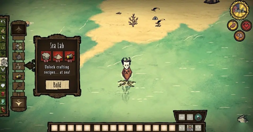 1、玩家先来科学仪器面前,打开后点击左侧航海按钮,放入材料制作海上陷阱。