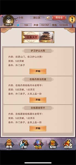 在灵根达到上品之后,可在门派内挂机门派任务,每10分钟会获取一次奖励。