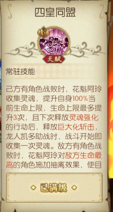 效果:为己方全体施加威严效果:花魁阿玲在场时,己方角色被攻击时,若攻击者生命低于历史最高的95%、60%、30%时,有100%的几率使自身(被攻击者)最终伤害减免一次提升10%、40%、70%。己方角色攻击时,如果目标生命值小于100%,将破除敌方防御手段(限制单次技能伤害效果失效)。 该天赋攻守兼备,不仅可以搭配其他技能和天赋使自身提高极高的伤害减免,极大提升了花魁阿玲的坦度;并且使对手单次技能伤害效果失效的效果可以有效处理某些强力保命技能,使得花魁阿玲的进攻能力变得十分恐怖。