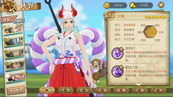 和之国罗、基拉为全队提供的增益以及新世界基德的高爆发配合起来的超新星阵容是当前佐乌&空岛十分主流的阵容。在超新星们用超高的爆发击倒敌方时,UR花魁阿玲可以多次触发【四皇同盟】,更好地处理对方生命值较高的角色;大和的爆发和格挡保命机制可以让她作为阵容后手的爆发点,为UR花魁阿玲补上最后的输出。
