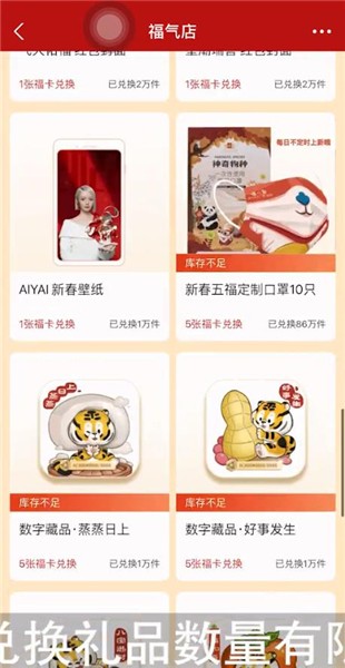 用户可使用五福福卡(即和谐福、爱国福、敬业福、友善福、富强福)参与兑换活动,使用的五福福卡不限种类,满足对应的福卡数即可。兑换礼品数量有限,不定时上架,先到先得。