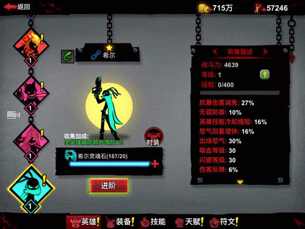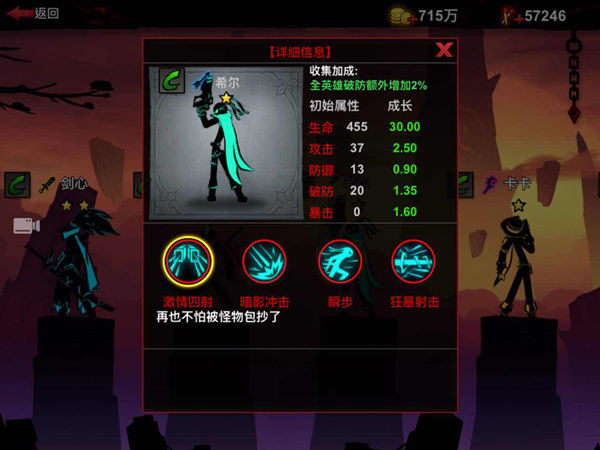 1、希尔作为火柴人联盟2里的ADC,其攻击力之高自然不用多说,相比于另外一个远程攻击英雄卡卡来说,其攻击力虽然稍逊了一点点,但是其初始的血量要高上一些。