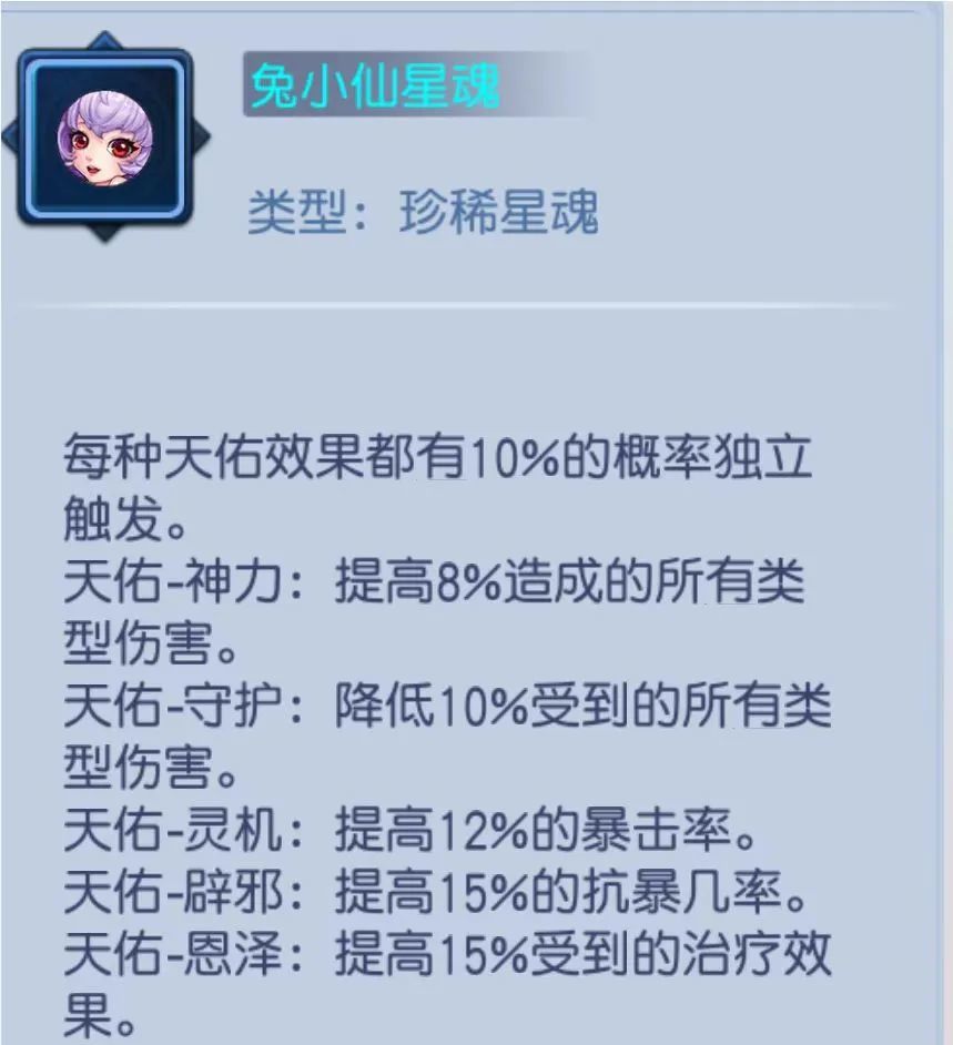 【星魂5级附加属性法术穿透5%,法术伤害3%。4凤凰20级后法术攻击杀死目标后,有30几率增加等级*1的法攻,可叠加3层。4人鱼20级后法术击杀敌人后,在2回合内给人物增加500蓝】